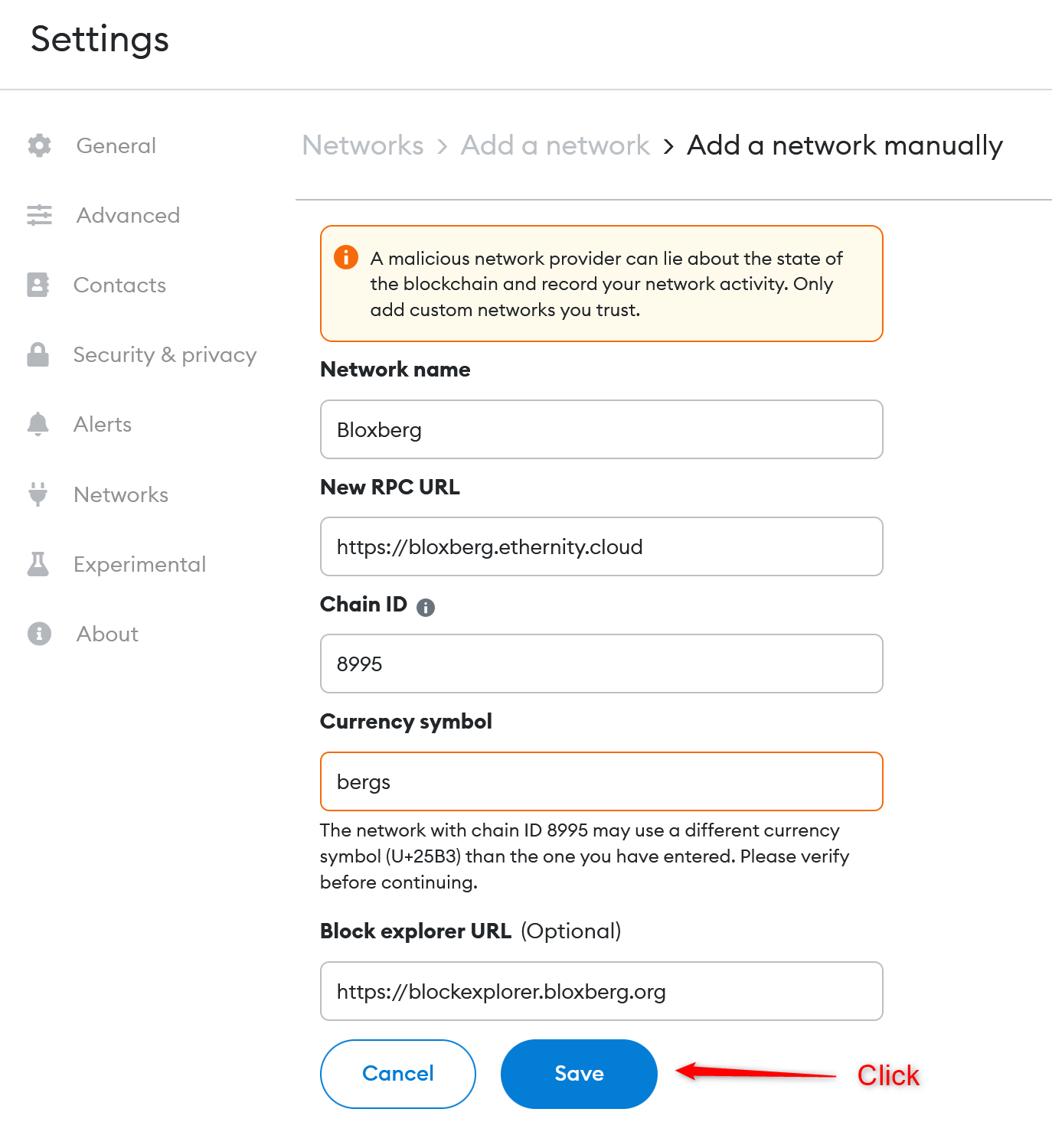 A confirmation message can be seen below when the Bloxberg network was successfully added as shown below.