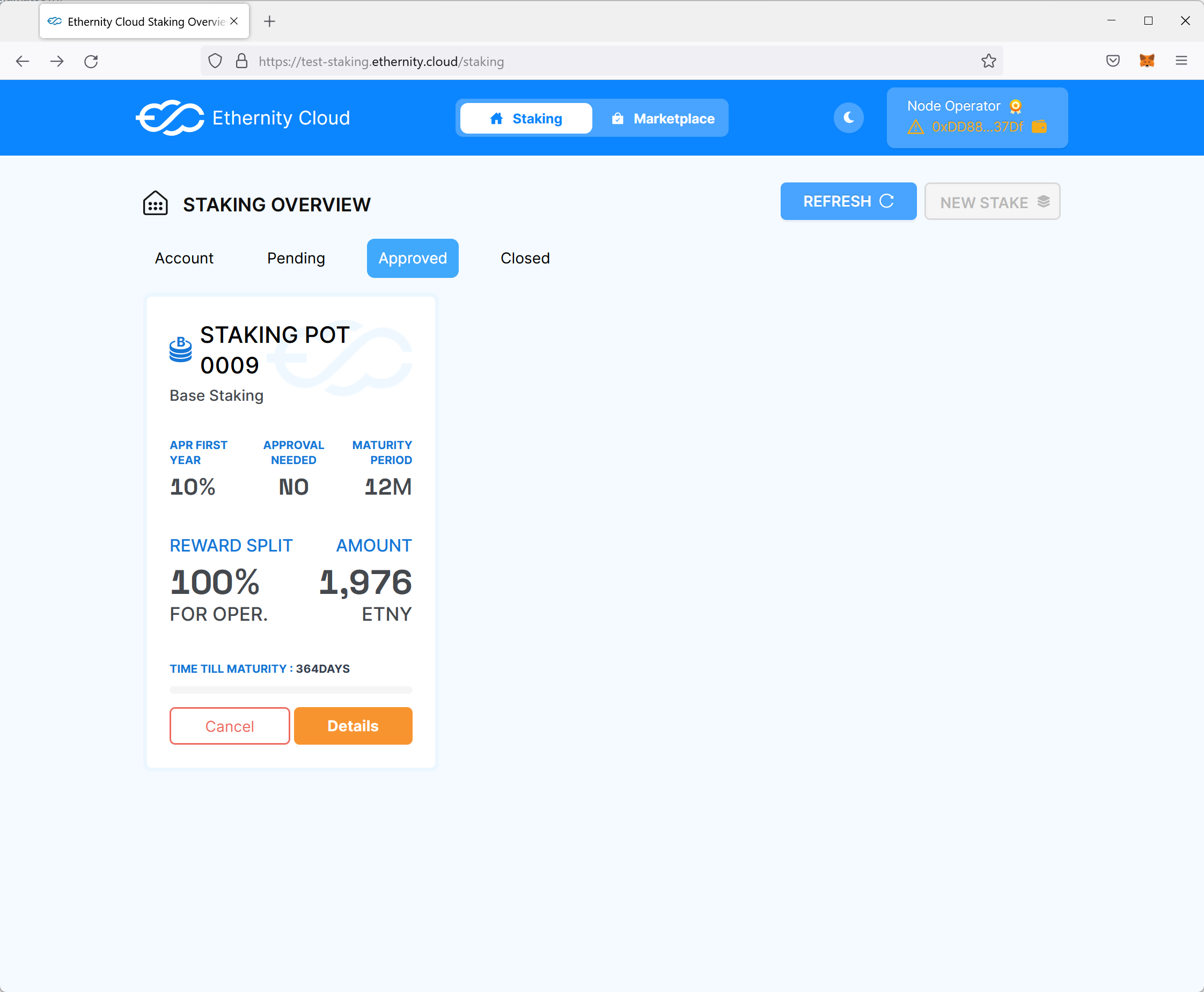 Now that we have a base stake in place which is smaller than **5,000** ETNY tokens, we need an extended stake on the same node so that both the staker and the node operator will start to receive the staking rewards.&#x20;