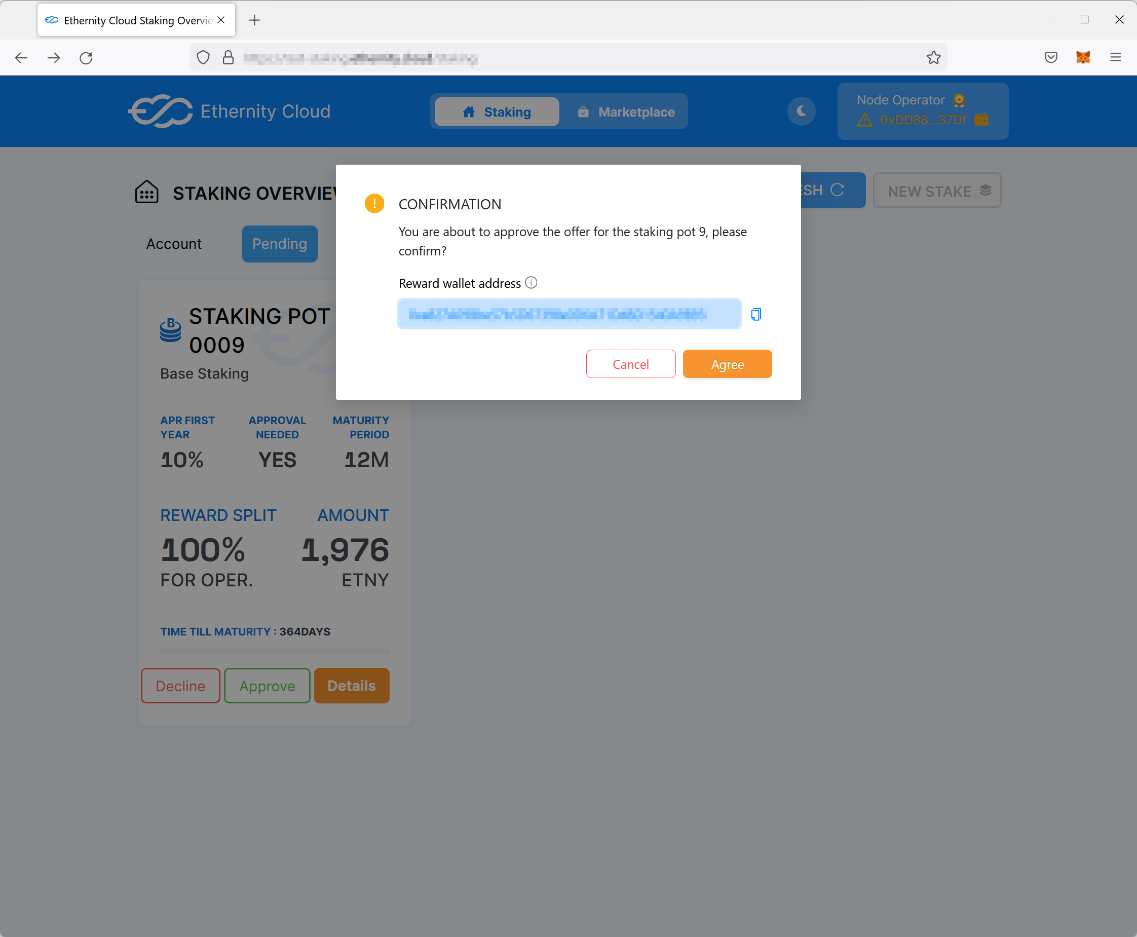 We will click on the *Approve* button to start the staking request for this pool. A pop-up will be seen as shown in the picture below. The node operator has to add the *reward wallet address* where all the rewards will be sent and to click on the Agree button.