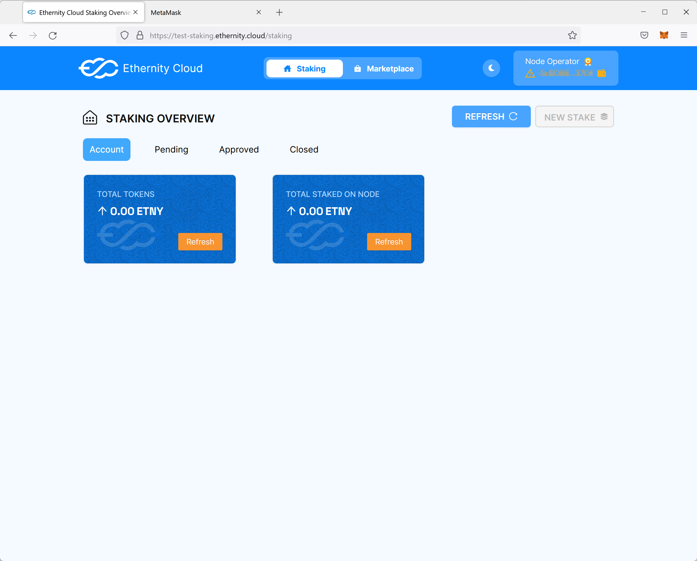 After the node operator connects the node wallet to the staking dApp he or she is taken to the Homepage as shown in the above picture. We can observe that we are identified as a *Node Operator* in the top right corner and the *NEW STAKE* button is disabled.&#x20;