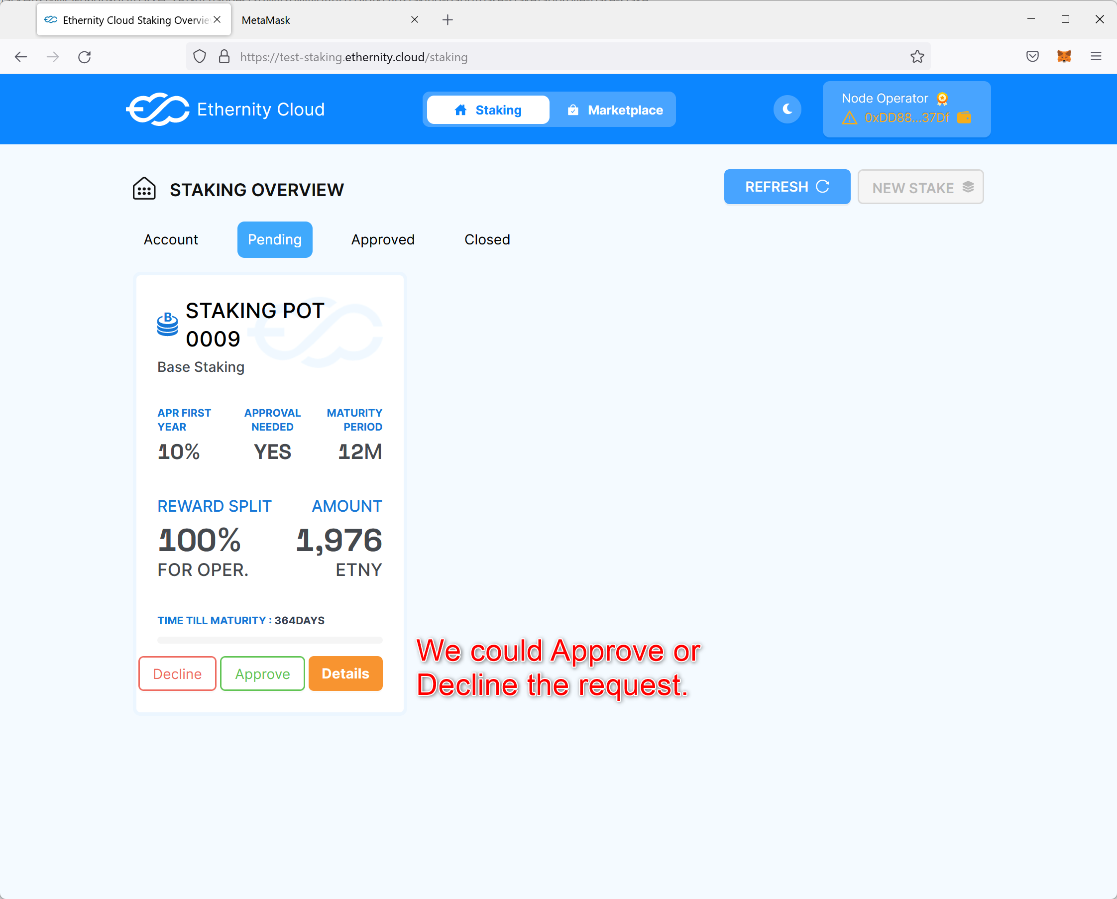 A node operator has to approve or decline a base stake request made by a staker. In order to do that the node operator has to connect to the staking dApp with the node wallet address through MetaMask. Please check the following sections [Node address and private key](https://docs.ethernity.cloud/staking-dapp/node-address-and-private-key) and [Import private key](https://docs.ethernity.cloud/staking-dapp/import-private-key) for how to achieve that.&#x20;