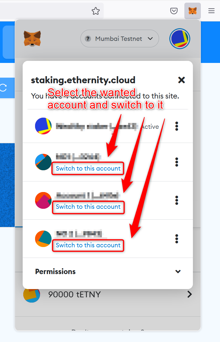 <figure><img src="https://1216336826-files.gitbook.io/~/files/v0/b/gitbook-x-prod.appspot.com/o/spaces%2F-MOFd6gpxgL4ITVYH_YB%2Fuploads%2FefsqZTeG9awF4l8MJZ5t%2Fimage.png?alt=media&#x26;token=5c89b547-e311-474c-9661-79fd42b5a31d" alt=""><figcaption><p>Select the wallet address that you need and click on <em>Switch to this account</em></p></figcaption></figure>