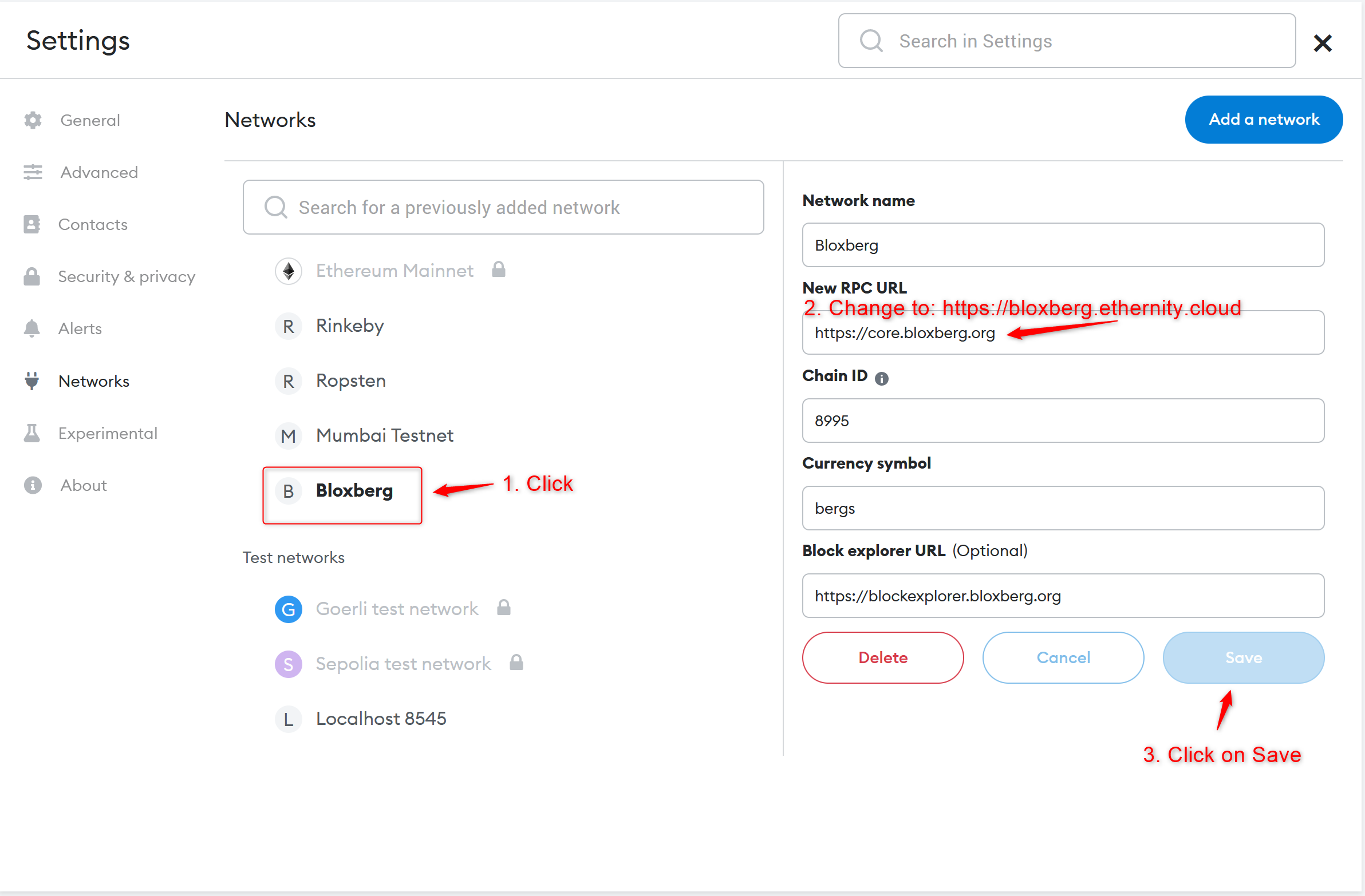 The instructions below show how to change the RPC server from the existing core.bloxberg.org to the new bloxberg.ethernity.cloud. Due to the overwhelming number of MetaMask wallets connected to the Bloxberg network we are changing the RPC URL for a better user experience.&#x20;